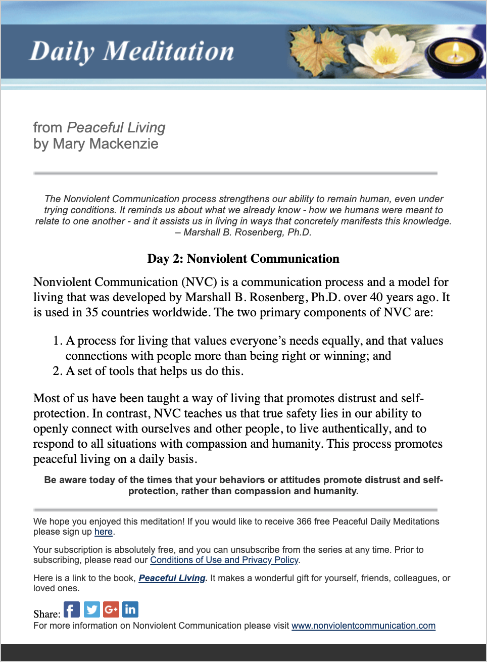 Register now to receive 365 days of inspiring, Nonviolent Communication (NVC) based Daily Meditations emailed right to you from Mary Mackenzie’s book, Peaceful Living. This year of meditations will help you begin each day centered and grounded in the power of compassionate, conscious living.